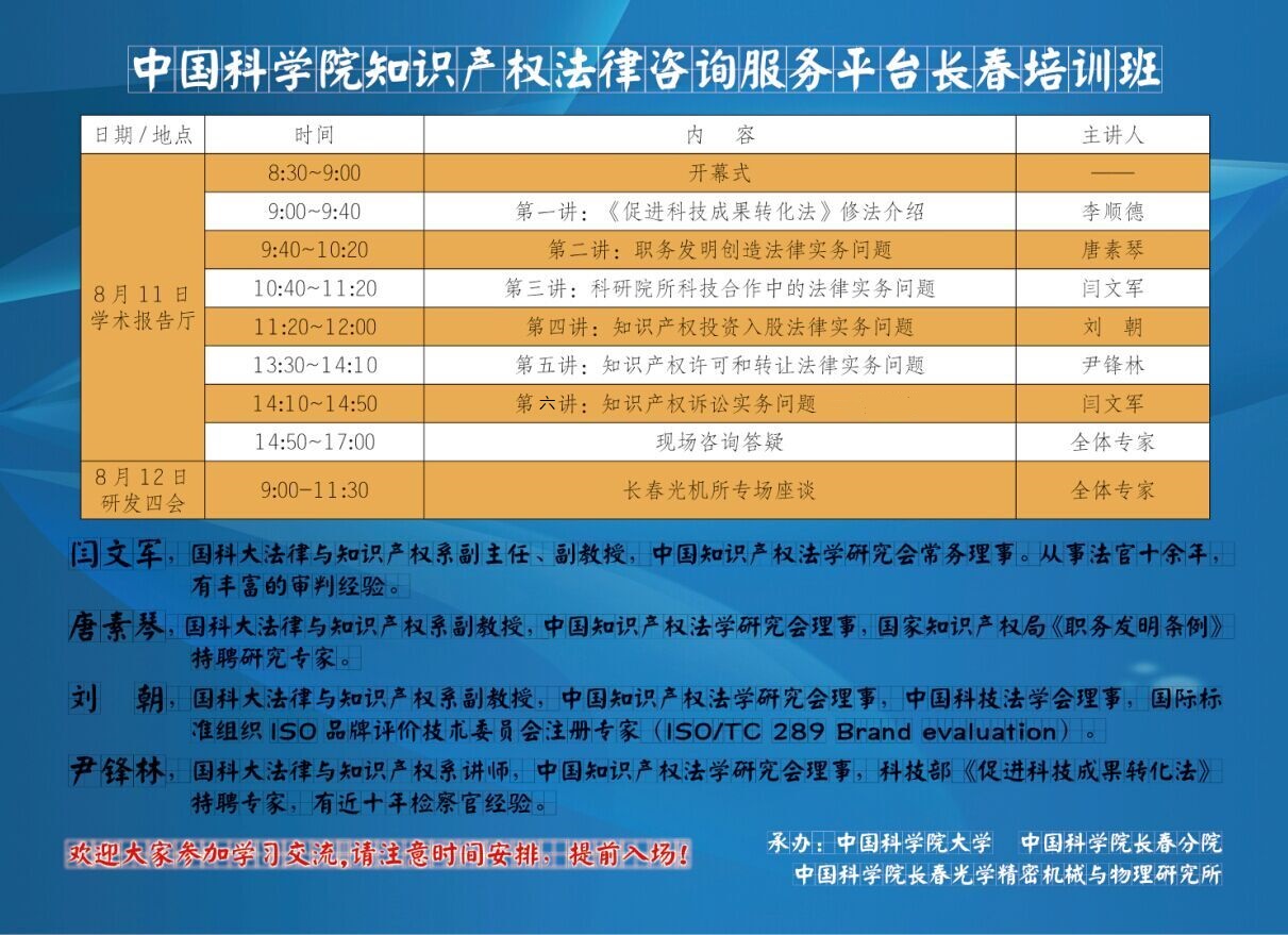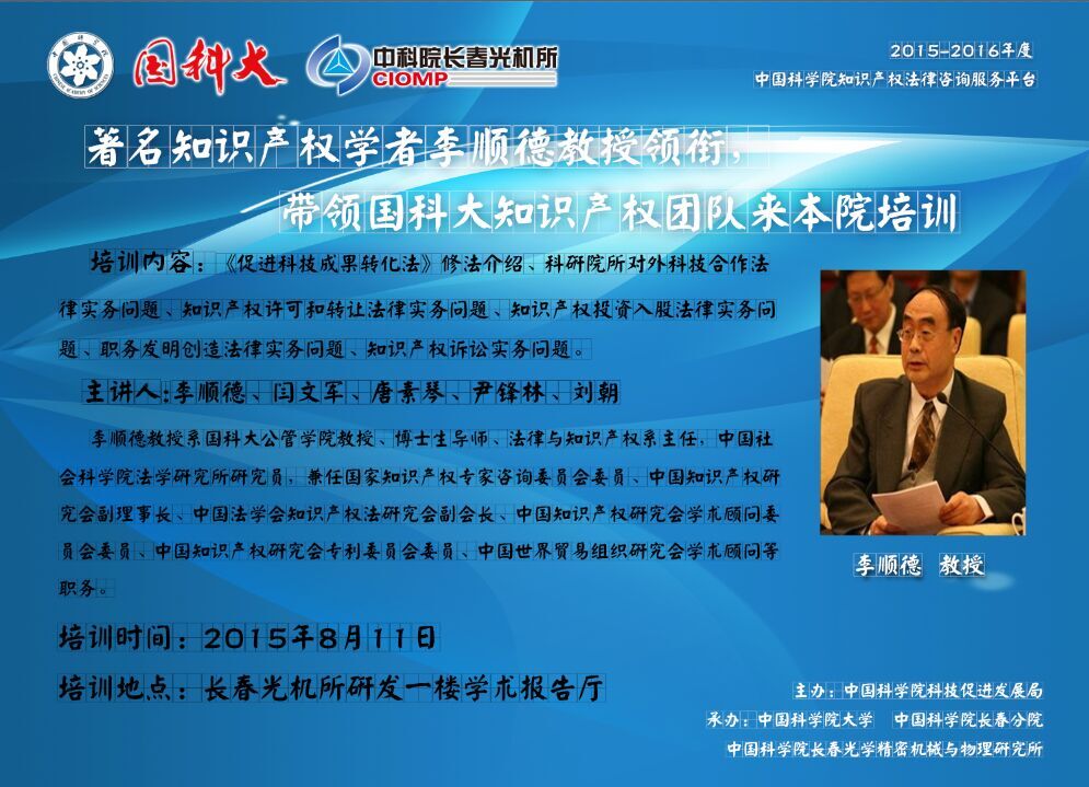 关于举办中国科学院知识产权法律咨询服务平台长春培训班的通知
